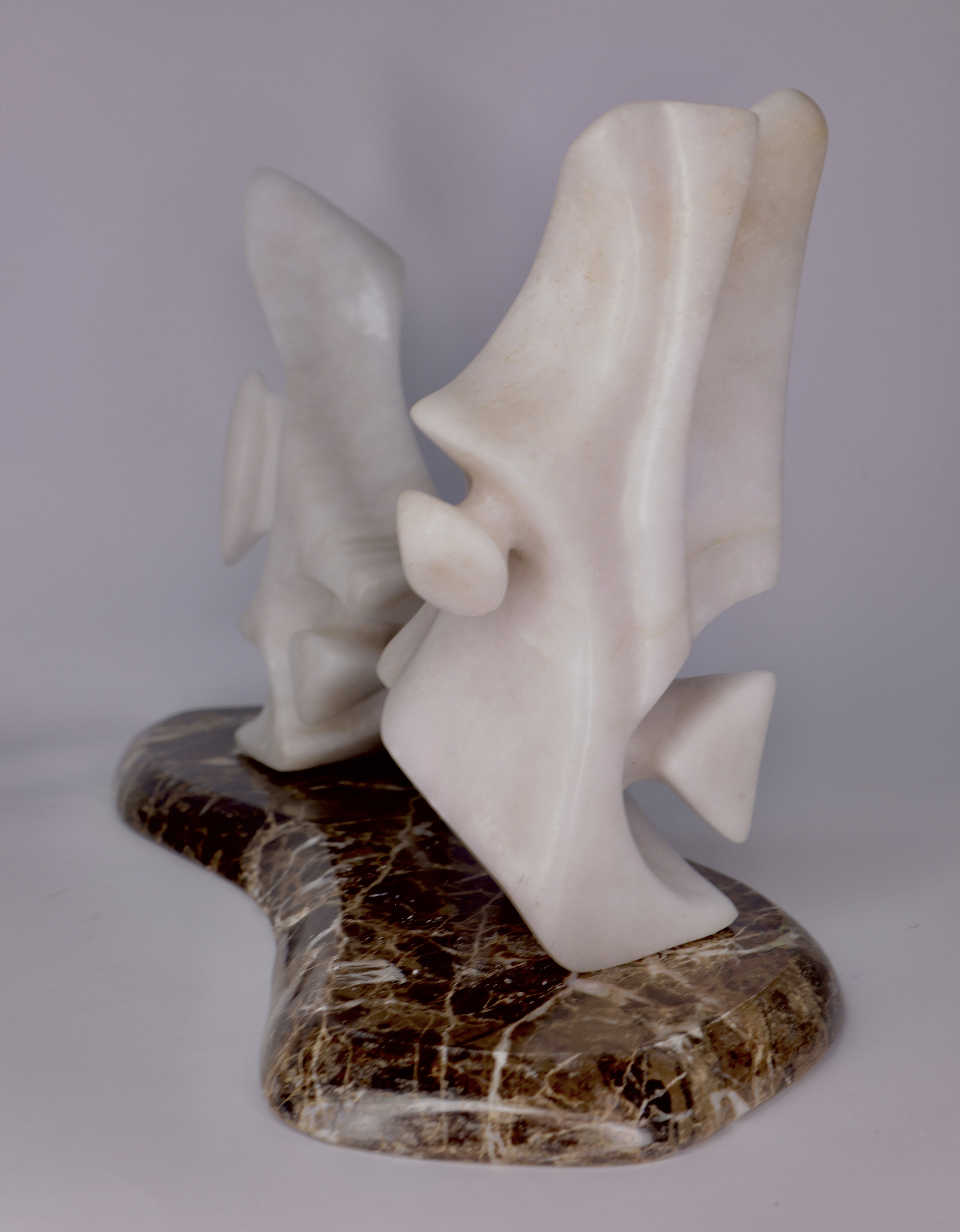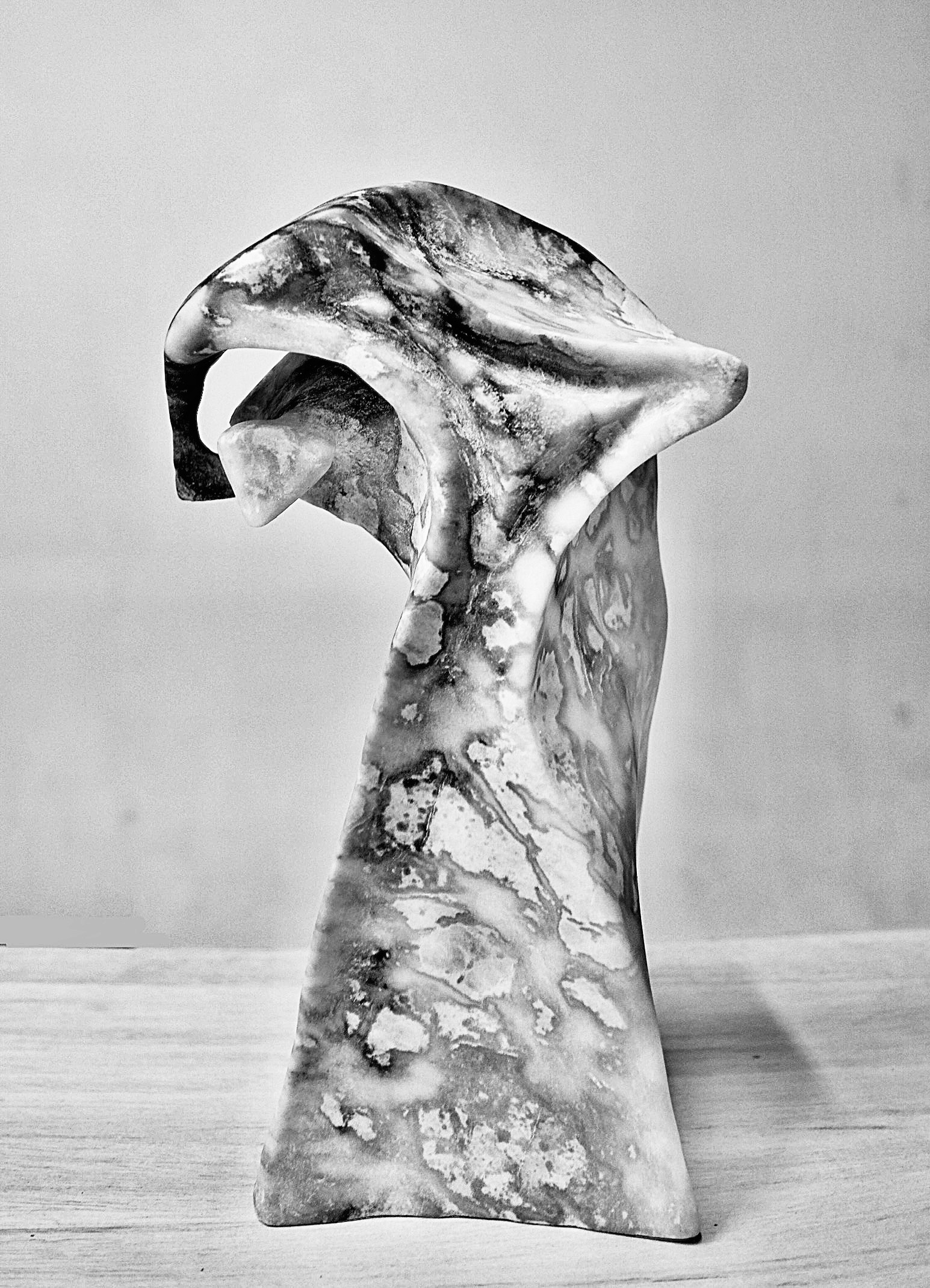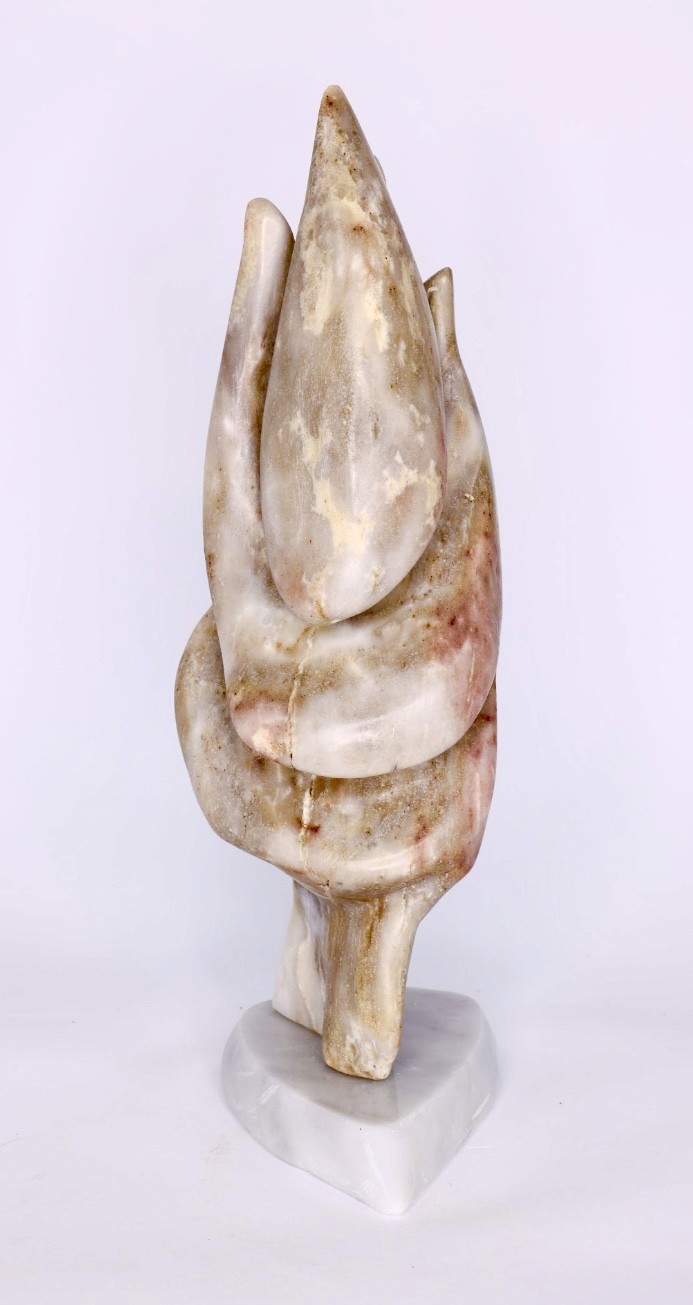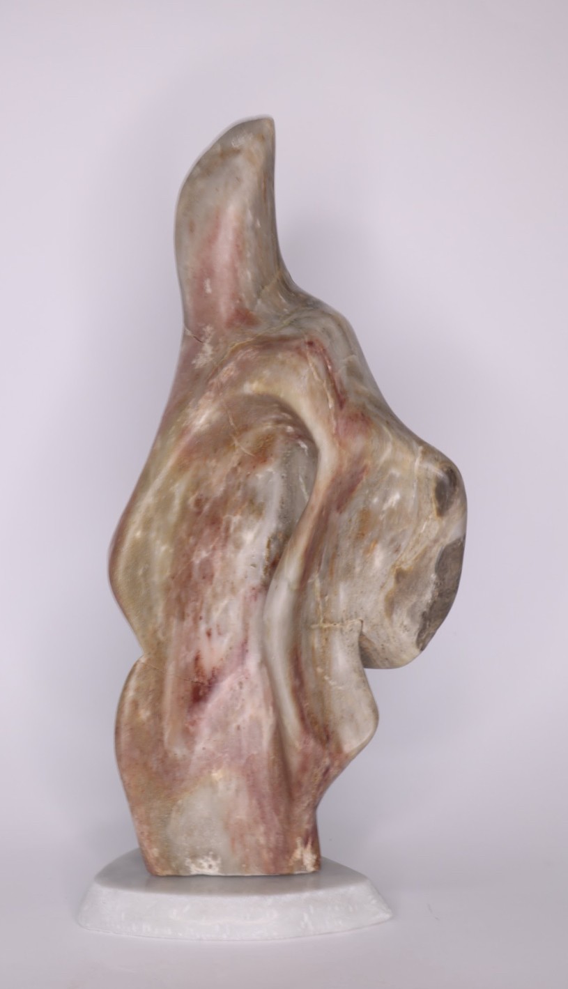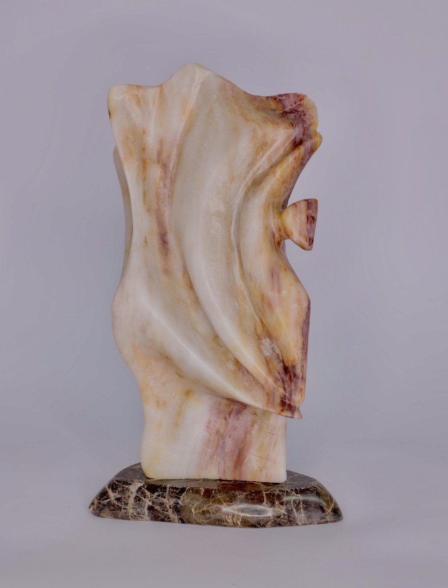 Alfredo Rolando Grosman works primarily in alabaster, engaging the material as both structural presence and conceptual field. His sculptures emerge through a process of subtraction, where mass is gradually refined into fluid, tension-based forms that balance weight and lightness.