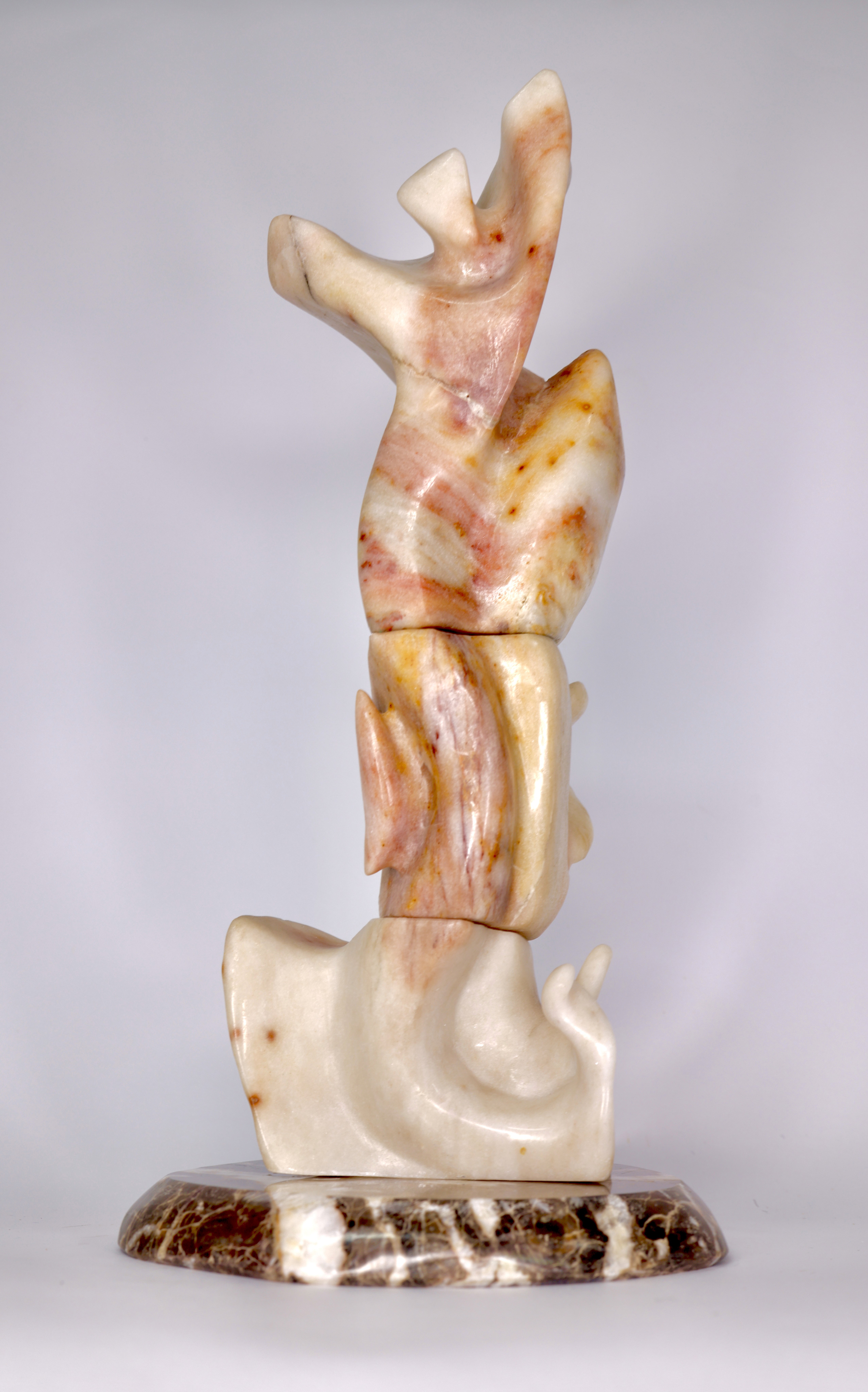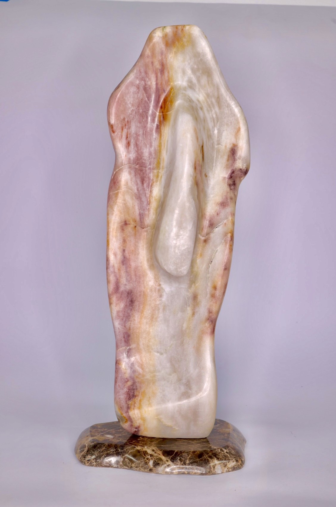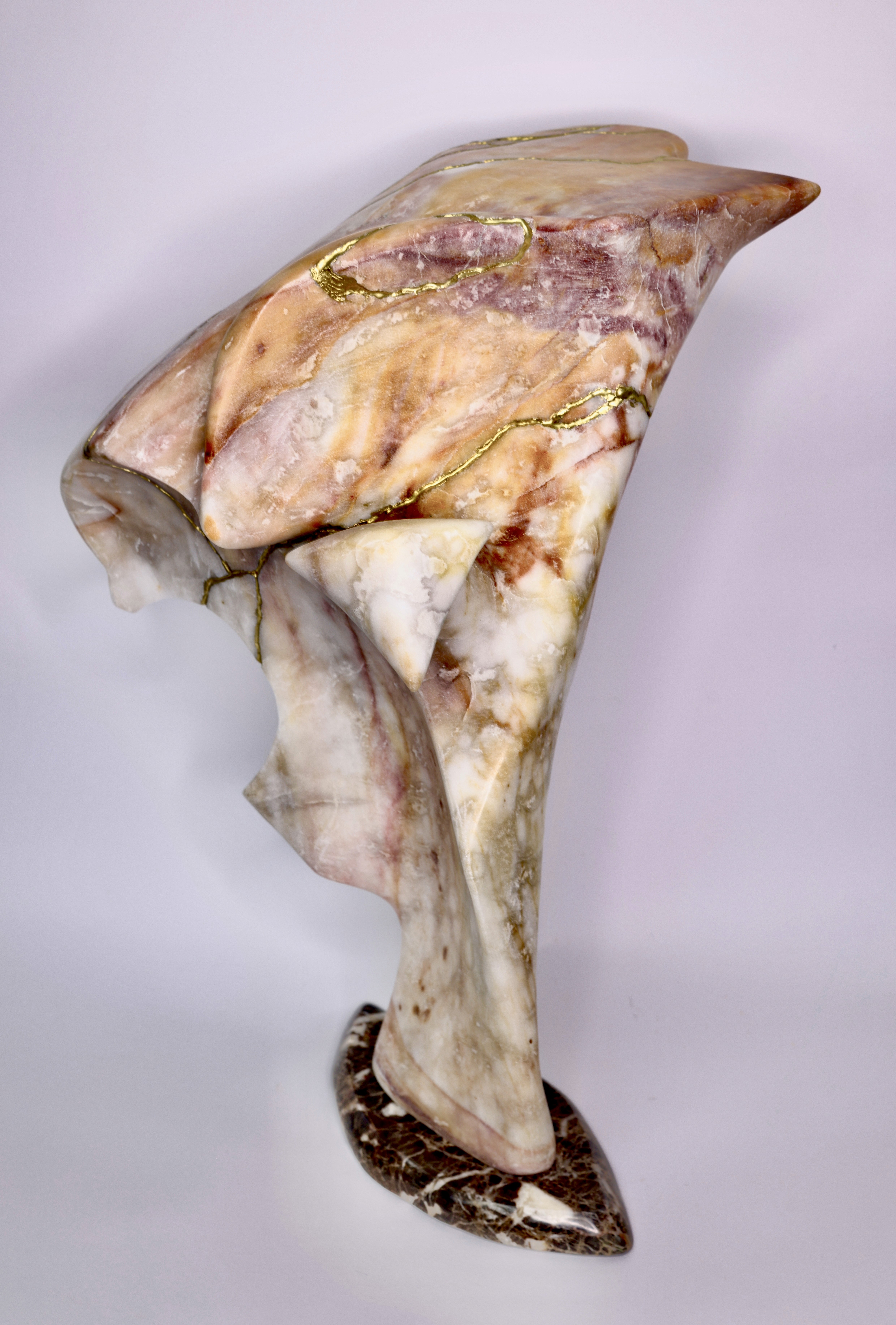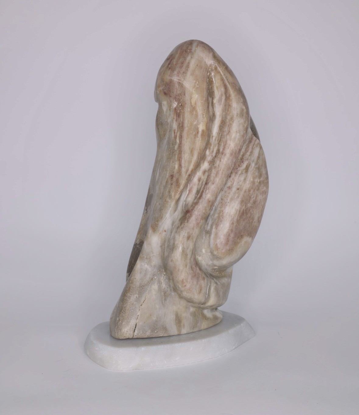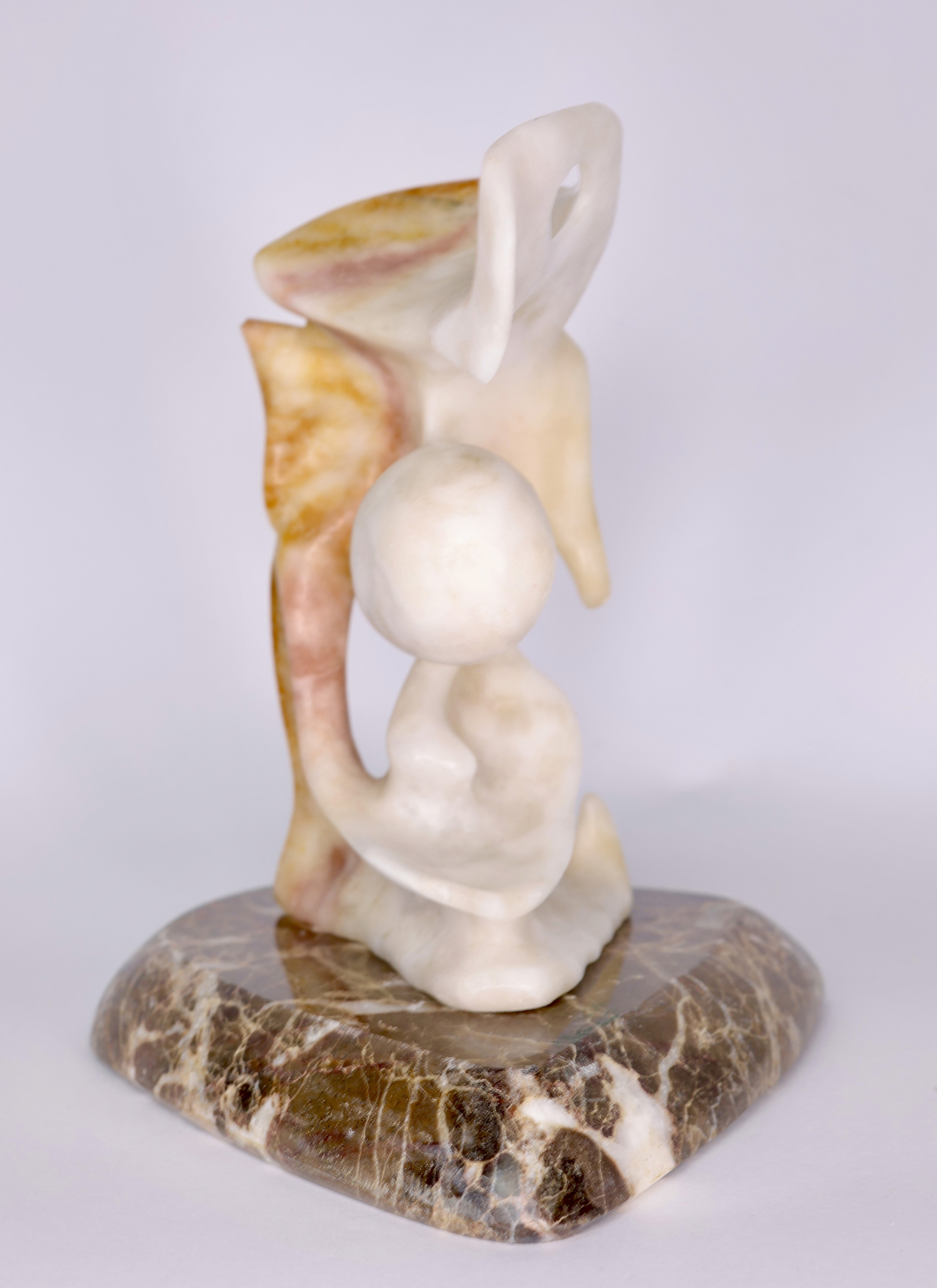 Alfredo Rolando Grosman works primarily in alabaster, engaging the material as both structural presence and conceptual field. His sculptures emerge through a process of subtraction, where mass is gradually refined into fluid, tension-based forms that balance weight and lightness.